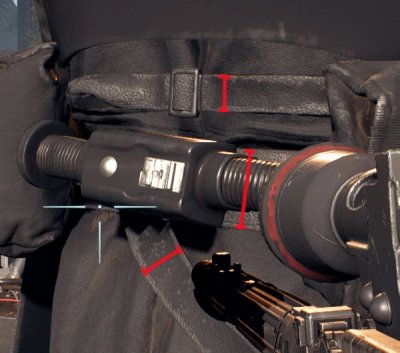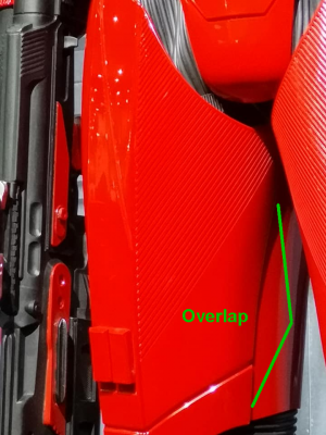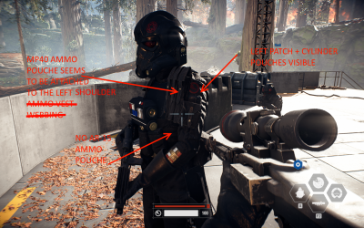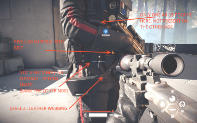 General Weir CRL update proposal open for membership discussion. Update primarily addresses alignment of the Weir text w/ our other Spec Ops scout CRLs (Shadow Scout / Swamptrooper). Additionally, adds Level 2 requirements to the CRL (making it eligible for our Specialist program). The bandoleer description, in particular, has been addressed and detailed based on source references to avoid GML confusion when approving the bandoleer. MEMBERSHIP REVIEW PERIOD WILL END ON 10/20/19. Special Notes: The armor parts shall be film-accurate or close approximation in gloss, semi-gloss, satin, or matte black and made from one of these types of materials or like materials: Fiberglass, ABS (Acrylonitrile Butadiene Styrene), or HIPS (High Impact Polystyrene). Blasters are not required for legion membership per our weapons policy. Helmet Scout style helmet accurate in shape and form. Eye lens is red or red mirrored. Helmet is painted to match armor. Flat or concave elevator bolts. Helmet may have three contrasting black vertical lines on center of forehead area or left plain. OPTIONAL Level two certification (if applicable): Ear Holes are correctly shaped and have no mesh. Black 3M Speedglas bolts or replicas are concave and mount the faceplate to the helmet. (Visible bolt head diameter of 22mm). Accurate snout detail and aerator with accurate parts, mounted onto a plate and painted a contrasting black to the helmet. Accurate three lines on center of forehead area. No visible seams on the dome. Optional: Black chin cup. Balaclava A balaclava is a black head sock/hood that is worn under the helmet and is used primarily to hide any view of the wearer's skin and/or facial hair. Flight Suit The undersuit is a one or two-piece black textile suit, such as military flightsuits, motorcycle racing suits, industrial work clothing (Dickies), or similar suit modified appropriately. Stand-up collar conceals the neck with an enclosing strap to keep the collar closed. Must have a suede or faux suede butt flap attached above the waist hidden by the cummerbund and is rectangle in shape. The flap is slightly narrower than the width of the trooper and stops slightly higher than the bottom edge of the troopers backside. Suede or faux suede thigh patches must be present, extending over the flight suit crotch and down the front finishing above the knee armor. The thigh patches must be secured by 2" (50mm) black elastic, sewn in under the front and back of the thigh patch. See the Scout Trooper Flight Suit page for detailed images of the patches described below. Suit must not have any visible labels, logos or zippers (including built in flight suit pockets). OPTIONAL Level two certification (if applicable): Suit is fairly fitted and not baggy. Real black suede thigh patches are present. Real black suede square/ rectangular butt patch is attached to flight suit at the rear under where cummerbund sits. The size will adjust slightly from scout to scout, but correct scale must be noted, no external visible stitching. Size will differ slightly from scout to scout, but correct scale is maintained. Shoulder Armor Black elastic is used to secure the armor around upper arm. Shoulder pieces do not have any adornment. OPTIONAL Level two certification (if applicable): Armor is secured around bicep with a 0.5" (12mm) black elastic strap. Bottom corners are rounded. Optional: Affix top of shoulder bells to shoulder bridge loops. Upper Arm Armor Armor has a recessed area with a red "T-bit" detail attached within. Black elastic is used to secure the armor around upper arm. OPTIONAL Level two certification (if applicable): Accurate "T-bit" detail is mounted to armor. T-bit circle detail piece faces forward on each arm. Armor is secured around the arm with a 1.5" (40mm) black elastic strap. Forearm Armor Black elastic is used to secure the armor around forearm. OPTIONAL Level two certification (if applicable): Armor is secured around the arm with a 1" (25mm) black elastic strap. Gloves Black leather and gauntlet length. Glove details include: Black suede or faux suede patches on top of the middle finger, index finger and thumb. Four tightly spaced ribs that span the knuckles. No labels/logos, clips, or external straps. OPTIONAL Level two certification (if applicable): Suede or faux suede padding on fingers and inside of thumb and correct gauntlet stitching. Bandoleer Shall be similar in appearance to the CRL model reference. Front-facing boxes/greeblies shall be made of hard material such as plastic or wood. If wood is used it must have the appearance of a hard plastic material. Crosses over the chest and falls straight along the sides of the back tank connecting underneath with the left strap crossing over the right. The back connection shall be made with Velcro. No buckle shall be used and Velcro should be hidden. Optional: The straps passing over the shoulders may connect to and end at the bottom of the back plate. See CRL model reference. Red 2" (50mm) nylon webbing shall be used for attaching the plastic bandoleer pieces. The left bandoleer strap will have 6 boxes, 1 greeblie, and ribs that match the CRL photo (from the shoulder to the waist) as follows: Horizontal ribs, 6 in total, shall be present from the top of the last box over the shoulder. A larger, vertical rectangular box with a raised circular detail centered in the upper portion of the box. A larger, vertical rectangular box with 1 long "I" shaped indents toward the center of the chest and a medium-sized and small-size indents parallel to the 1 long "l" shaped indents. A center greeblie that has 1 wider pill-shaped box and 2 horizontal cylinders. A larger rectangular box with a reversed L-shaped indent. A small rectangular box. A medium rectangular box. A small rectangular box. A small rectangular box with a horizontal "T' detail. The "T" faces towards the back. Horizontal ribs, 2 in total. The right bandoleer strap will have 9 pouches/boxes that match the CRL photo (from the 