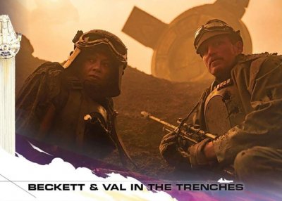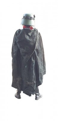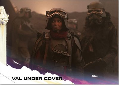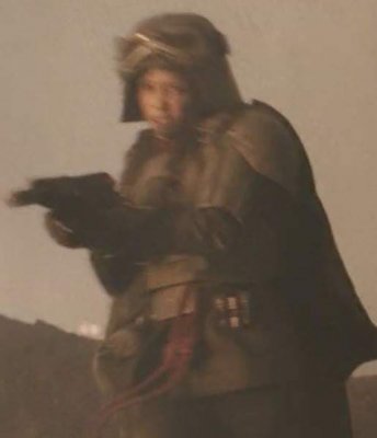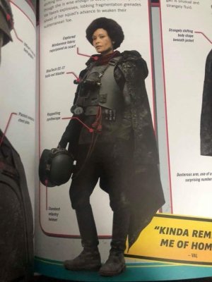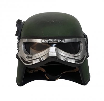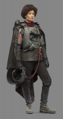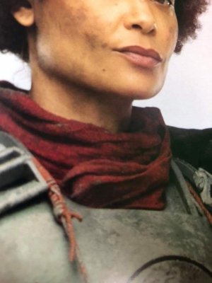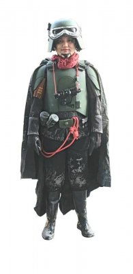 20. Model: 80678 Photo by: Jim Tripon Prefix: TX Detachment: Spec Ops Context: Solo: A Star Wars Story Description: We first encounter Val in the trenches of Mimban. Wearing the armor of the 224th Imperial Armored Division, or more commonly called “Mudtroopers." She fought alongside Han Solo, with Captain Beckett, Rio, and Korso, but there is more to this unit than meets the eye. HELMET · An open-faced, flared helmet which consists of a dome with rim and helmet skirt. · A telemetry unit is attached to the right side of the dome and is aligned with the rim. · The telemetry unit consists of a rectangle box with detailing that should match the reference image. The telemetry unit is black. · The lower end of the telemetry unit sits out from the helmet to allow the goggle elastic to feed underneath. · A rubber trim, or the illusion of a rubber trim covers the edge of the helmet rim with the join made at the rear center of the helmet. · Metal/silver Imperial code disks are positioned on both sides of the helmet skirt. These may be weathered. · The helmet is to be painted in matte field grey to match the armor. The helmet paint finish may be slightly textured, and is moderately weathered. · Helmet has a black chin cup with tan webbing strap. Tan webbing should be lightly weathered. OPTIONAL Level two certification (if applicable): · The helmet has a black/dark gray polystyrene inner liner consistent with that of a skate or bike helmet. · Disks do not feature a notch or groove details. HAIR · Seen underneath the helmet is dark, reddish brown curly hair in the Afro style · Wigs are acceptable GOGGLES · Goggles shall have an aged chrome frame with detail painting, and weathering to match reference image. The knurled nose bridge adjuster is brass in appearance. · Goggles shall have a trim around metallic frame. Trim shall be rubber or foam. · Goggles have dark angled lens featuring two flat panels on each side. · Goggle Strap features two sizes of elastic - The thinner elastic strap attaches directly to the goggles and is sewn to the larger strap, which forms the main goggle strap. · The goggle strap features a number of buckles: · There are metallic buckles on each side of the goggles through which the 1" (25mm) elastic is threaded. · A large buckle greeblie on the lefthand side through which the 1.5" (40mm) elastic is threaded. This greeblie features a beige square. · Two black plastic tri-glides on the right rear through which the 1.5" (40mm) elastic is threaded. · Goggles may be worn over the eyes or on the brim of the helmet OPTIONAL Level two certification (if applicable): · Serrated 1" (25 mm) slide buckles on each side of the goggles through which the 1" (25mm) elastic is threaded. · Goggle straps are approximately 1" ( 25mm) and 1.5" ( 40mm). SCARF · A apple- red color scarf is worn loosely around the neck. Smooth in texture, matte surface. PONCHO · Plash Palatka Style Poncho. · Poncho is dyed or painted black. · Tied or otherwise attached under the chest armor and worn to cover the back plate. · Poncho shall be heavily weathered. OPTIONAL Level two certification (if applicable): · Ring Grommets shall be leather to match reference photo or metal grommets shall be covered with leather to mimic leather grommets. TUNIC / JACKET · A long-sleeved, dark charcoal grey, jacket that falls between upper and mid-thigh. · It is of a darker shade compared to the regular Mudtrooper jacket · Has a high mandarin style collar with an open space in front. · Has two panels on either side of the front, extending to the bottom of the jacket. · Has a stitched "cuff" on the sleeve that extends to around the middle of the forearm. Look may be created with top stitching. · If side pockets are present, they are built into the jacket, with no covering flaps present. · No outer stitched pockets are acceptable unless they are fully covered by the armor. · Shall be moderately to heavily weathered. OPTIONAL Level two certification (if applicable): · Jacket is made of heavy weight bull denim Twill material. · There is an imperial cog patch sewn on each shoulder and are made of an embossed 3D vinyl material. · There are code cylinder pockets on both outside panels of the jacket from about half way between the top and bottom of the seam where the arm connects to the body. CHEST ARMOR · Chest Armor matches visual references. · Accurate shape/design to front of chest. · There is an indented area around the outer edge of the center flat section. · Buckles attache to upper chest plate. · Shoulder straps are affixed to the chest plate at the buckle. · To the lower left side of the center flat panel is a recessed area angled inward from bottom to top with a raised rectangle greeblie and a recessed horizontal elongated oval. · Left of the recessed area is a raised square that extends from the center to the curved side of the armor. · On the top left side of the raised area is a raised oblong detail that protrudes outwards. · Chest and straps shall be painted field grey and be moderately weathered. OPTIONAL Level two certification (if applicable): BACK ARMOR · Back Plate has a collar that extends upwards and tapers to the chest plate. · Chest and back plate meet at the sides. · Black foam extends from the arm openings. · 2 hose connectors located at the top of the back plate approximately centered above each rectangular cut out/greeblie. · Back has two large cut out recesses with vent details and greeblies inside. · The walls and floor the recesses shall be matte olive green. · Each recess has different and specific set of boxes inside. · Bottom left features a smaller rectangle cut out with the left side stepped. The floor of the cut out and the walls inside match the matte field grey color of the armor. · Half circle indent detail beneath the backpack section must be present. · There is a long thin raised greeblie positioned central and below the 2 large recess. · The