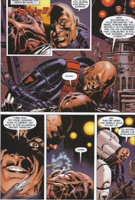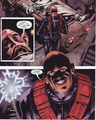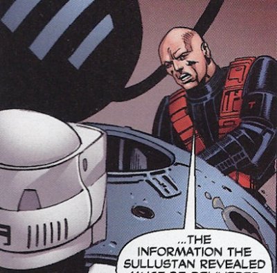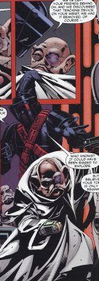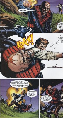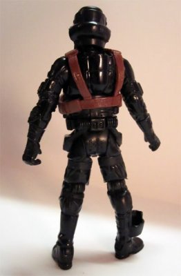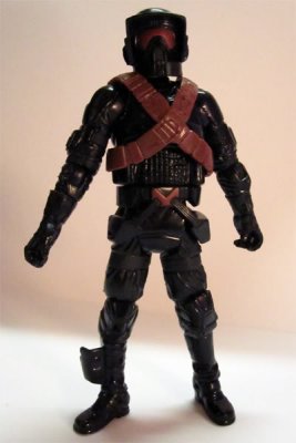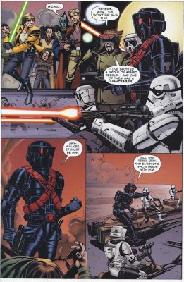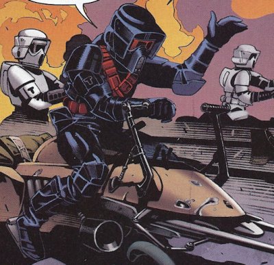 The original WEG Storm Commando picture. Notice all the custom armor. Star Wars Galaxies TCG The Hasbro Storm Commando figure: I'll take full 360 shots of it when I get a chance later. These were on the web. They took some of the SC pieces from above for the head and shins, but used a Shadow Scout body, probably to save cash on the mold. Star Wars Minis Rebellion Era Campaign Guide (WotC): Not a clear shot, but you can still see the custom visor and squared ears. These are wearing scout boots though. This used to be in the SW Databank. Still has custom forarms and shins (judging from the top) You can see the angle on the side of the visor going from the ear to the top of the brim, as opposed to the straight fall on the scout visor. This one has scout knees pads on it. This one has a cool WWII style bucket, but it differs the most from every other reference and uses TK pieces for the thighs forearms and handplates. Every other piece of armor seems custom, as they don't match either scout or TK style. --------------------------------------------------------------------------------- -iz