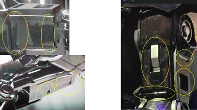 Next up: Revision 0 Forearm Armor Gloss black in color except as noted below. One on each forearm and are not interchangeable. Each forearm is a mirror image of the other. Forearms have an elongated rectangular appearance with the upper (elbow) end wider than the lower (wrist) end. There is a raised band around the upper section approximately 1/5th the length of the total forearm. The rear panel is smooth with no details. The front panel has an elongated rectangular recess with a piston like detail insert. The insert is painted metallic black or silver. The inside panel has an elongated rectangular recess approximately 20-30mm wide which starts at the raised band and runs the length of the forearm ending at the wrist. The front panel has a raised panel detail. The panel has a horizontal rectangle cut out positioned in the upper 1/3rd of the panel and a square cut out positioned in the bottom half similar in appearance to the bicep raised panel. The raised panel is painted metallic black, matte black, or dark gray. Both have a horizontal rectangle cut out positioned in the upper 1/3rd of the panel and a square cut out positioned in the bottom half. Forearms may be slightly weathered but must be uniform with the rest of the costume.