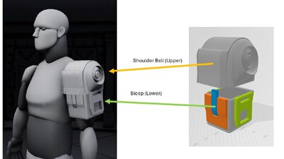 We have previously discussed the chest and back armor which has a "shoulder plate" similar to a pauldron. I named it Shoulder bell armor to align with other "shoulder bells." Below it is another section that I have named as "Bicep Armor" The onscreen suit appearance presents itself as an upper piece which overlaps a lower piece. We can name it what ever we want but I was just sticking with previous naming conventions.