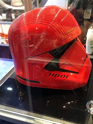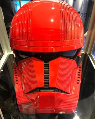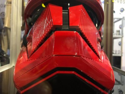 6. This section of the CRL is now in Pending Agreement State. If accepted all text will be moved to the main part of the Sith Trooper CRL Helmet Finished in a high gloss deep red that matches the colors of the entire costume Lenses are black in color. They may be bubble in shape or flat and must be sufficiently dark enough to obscure the costumer's eyes The lens frame extends back underneath the trap and terminates about 1cm from the back of the trap The brow extends out from the lens forming a significant overhang There are two recessed lines that run parallel to and are above the brow The bottom line recess extends above the clip greeblie running parallel to the trap and connects with the recess at the rear of the helmet The top recess terminates where it intersects with the bottom recess line A "Mohawk" section runs along the centre from front to back but is not raised. 16 recessed lines run parallel to the "Mohawk"-like section from front to back on each side The mohawk starts from the 2nd brow line and extends toward the back, terminating in the recessed lines at the back The frown is semi-gloss black with the following features: The mouth has one centre "tooth" that connects to the snout and is separated by a detail that has greeblie section that has 14 "ribs" The mouth has 4 teeth either side of the centre “tooth" There is no hexagonal mesh in the mouth area between the teeth The area from the bottom of the mouth extending to the tears has hexagonal mesh The centre tooth is the width of the bridge and has 14 little ribs at the top The jawline is angular and has the following flat trapezoidal section the extends 3/4 way down the jawline from the frown flat triangular sections one each side of the trapezoid 10 recessed lines extend from the base of the flat triangular section Each tear (area beneath the corners of lens frame) is angular solid matte black recessed circle in the bottom most corner has 3 recessed lines separating the top tear from the bottom section Face plate is two separate angular pieces that mirror each other with 14 recessed lines on each Curved lower section that starts from the tear and curves towards the front of the jaw forming a filleted ledge. The ledge is more pronounced at the tear end smaller towards the frown. Faceplates are separated by a channel that runs vertically along the bridge of the nose between the lens and frown The bridge of the nose has 10 small rectangular ribs from frown to lens frame with one larger one at the top The side of the jawline has Seven rectangular cut out vents/tube stripe slots are on each side of the helmet. They have the appearance of being black at the base of each slot 5 recessed lines extend from the front of the jaw and terminate in an angled manner below the trap. There angle of termination is complementary to the black trapezoidal shape Two helmet clip greeblies are present over the traps on each side Directly below the traps is a detail comprised of a vertical alignment of shapes in the following order a small raised circular shape a recessed B shape a small raised circular shape Below the traps toward the back and base of the helmet is a small black trapezoidal stripe There are 5 recessed lines at the back forming a trapezoidal shape. The angle at which the recesses terminate are complementary to the rear black trapezoidal shape There is one slightly wider recess channel that extends all the way around the base of the helmet The base of the channel is black is about 8mm wide by 8mm deep matches all the angles of the helmet as shown The bottom of the helmet has a black ledge that runs the perimeter of the helmet that extends back into the interior is about 3/4" to 1" wide matches the angles of the helmet, most notable is the jawline OPTIONAL Level two certification (if applicable): Lenses are bubble-like or bulbous in shape Lens frame has 4 recessed notches near the top of the tear The Brow has the following details There is a cutout section under the brow There is a raised section underneath the brow that has a pattern comprised of 62 recessed pill shapes The teeth are are metallic black or a very dark grey Faceplate pieces are visibly separate pieces, 4 slots under each faceplate for covering the teeth The tube vents are a solid backing and painted black. No mesh or cloth is present The helmet clip greeblies are the correct clips (refer clip greeblies diagram)