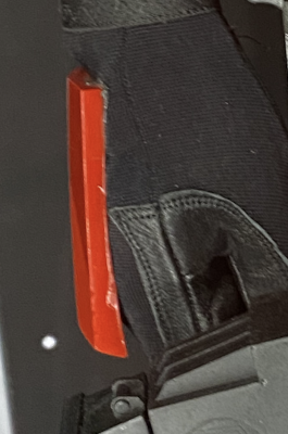 19. My flashlight mount was part of the blaster kit from Tom. I just used CA glue, has never come off Just some notes: Not that this matters for approval but the magazine on the blaster seems way too big? When strapping in the SE-14r to the little leather strap, you want to make sure that the long strap wraps around the scope mount, otherwise you might find it on the ground or dangling. For the side pieces you are missing, you can either cut some black ABS to shape, or use a piece of thick rubber as I have seen others do. If you need help with the shape I might be able to provide you with a pattern.