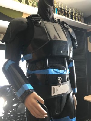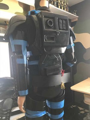 I purchased my armor kit from 850 Armor Works. I've got all the armor rough trimmed, I'm going to start sanding edges to fit my body, but here is a (ROUGH) mock up using masking tape. Its nice to have a mannequin to throw stuff on! Also got the boots in the mail today and they look spectacular. Things are moving smoothly so far, my dream is to have it done for Motor City Comic-Con in 2 months. Thoughts?