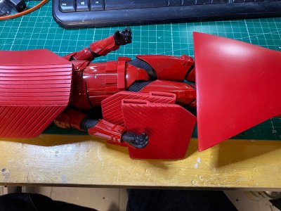 A little bit of progress. Looking at the text draft for the back plate, I realized that mine doesn't match. Yay, another part that needs tweaking. I cut out the trapezoid shape below the left shoulder buckle and replaces it with a 3D-printed part that has enough lines. I also cut out the circle and replaced it with a 3D-printed part that has a wider seam between the upper and lower halves. I'll add a black circle to the back which will be easier than masking off the black sections, so they're currently "see through". Lastly, I added a plate on top of the lowertrapezoid so reflect the shape standing out more from the base plate towards the top. I also added the lines on the outer back panel of the left forearm which were missing completely on the part from my kit. On the inner panel, I'm replacing the Pickatinny rail with a printed part as well.