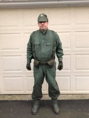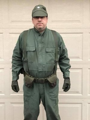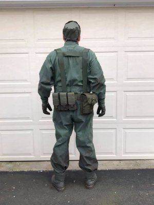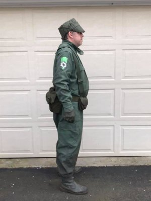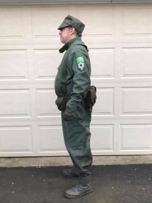 For my build I went with 2" below the shoulder seam for the patch. On this real military garment, the armscye is off the shoulder, while in the references it's drawn at the top of the shoulder. This puts the patch visually in the correct place on my arm as a whole, IMO. I will also move the buckles closer to the pistol belt as seen in the one reference.