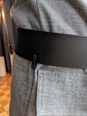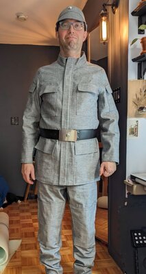 My tailor has finished working on my Imperial Boot suit. It was way too large. Much better, now. I've also added the belt loops. Btw, the belt itself was just for the test. It isn't the belt I'm going to use with this costume.