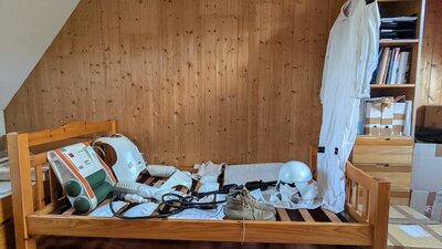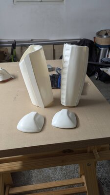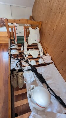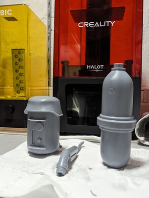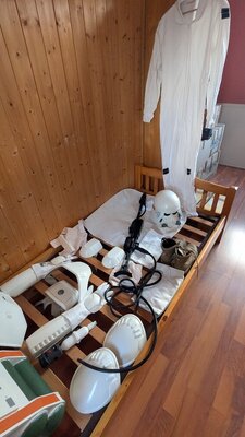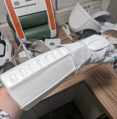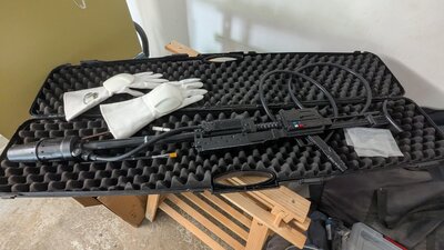 Here are the gloves and the flamethrower mounted. I finished the white parts of the blaster and added the hose. I like this thing π